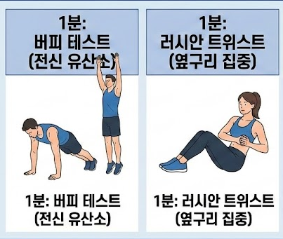 • 버피 테스트: 전신 근육을 사용하며 칼로리 소모가 가장 큽니다.