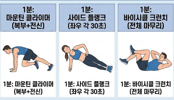• 마운틴 클라이머: 엎드린 자세에서 다리를 빠르게 교차하며 복부와 유산소를 동시에 잡습니다.